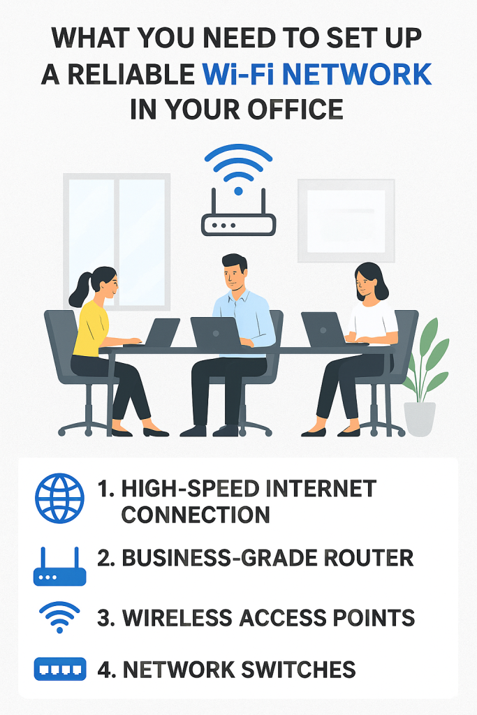 By investing in the right equipment—such as routers, access points, switches, and UPS backup systems—and implementing strong security measures, your office will enjoy seamless internet access that supports teamwork, video conferencing, and cloud applications. Whether you’re a small startup or a growing company, a well-planned Wi-Fi setup ensures your employees stay connected and your business runs smoothly.